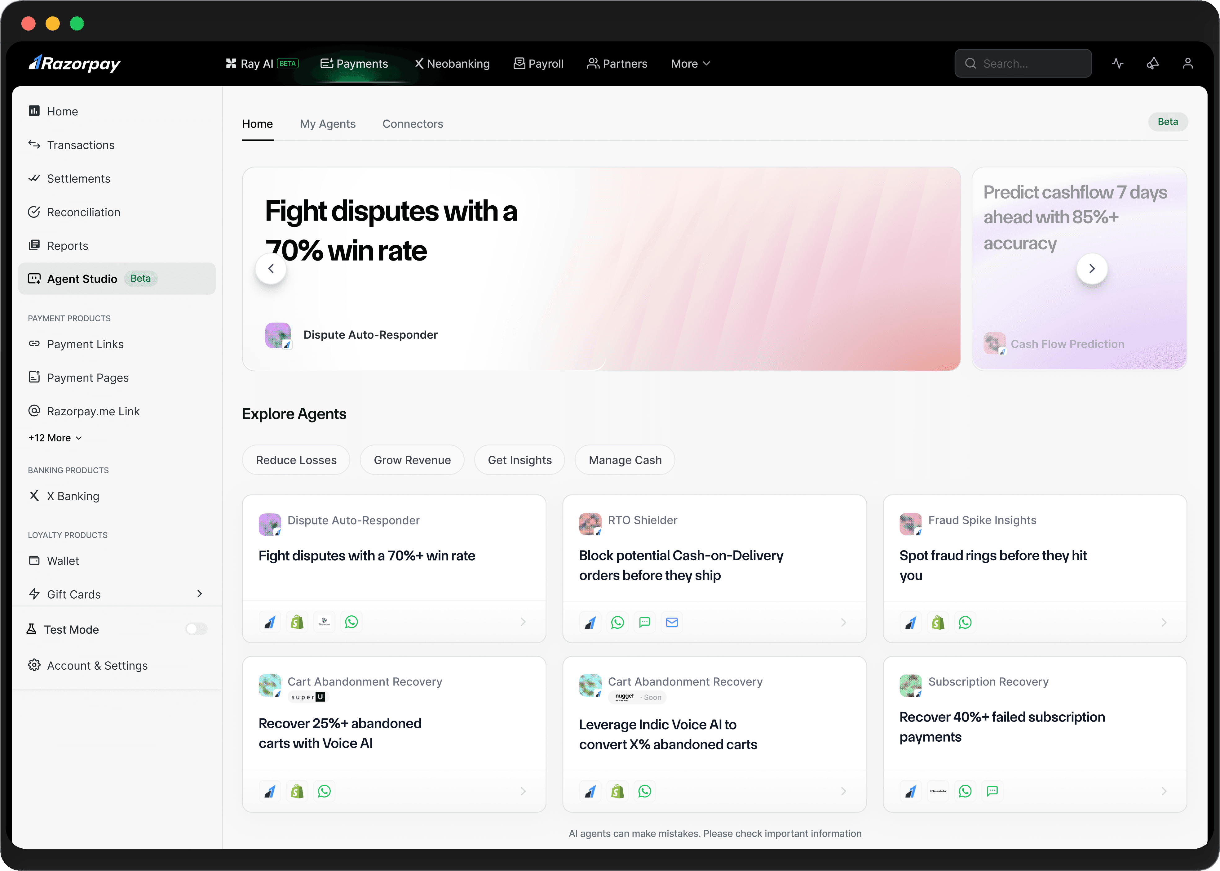 Predicts cash position 3–7 days ahead with alerts for payroll risk, shortfalls, and payout failures.