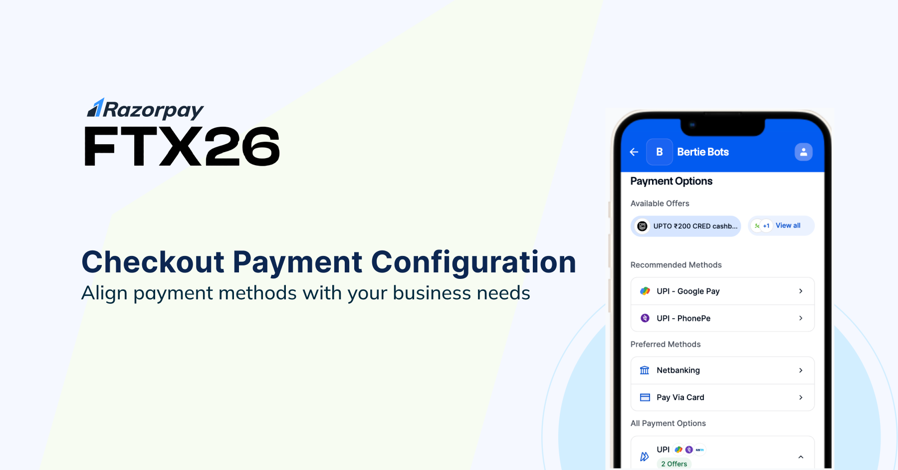 Checkout Payment Configuration on the Razorpay Dashboard gives businesses control over how payment methods are displayed. It allows you to shape the checkout experience to match your business requirements and customer preferences.