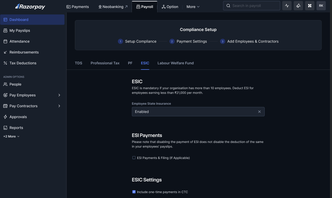 - Navigate to Settings > Compliance Setup > ESIC Payment Settings.