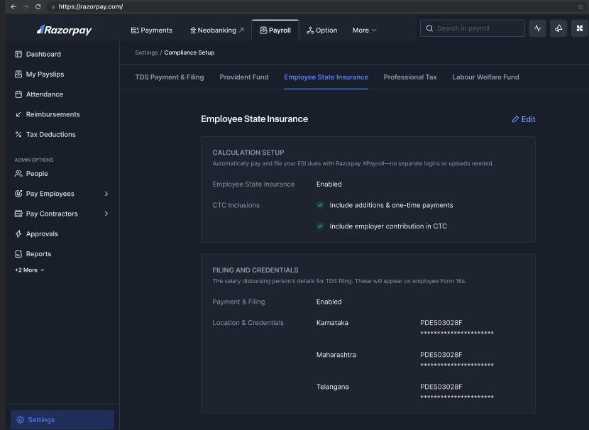 Set up, pay and check ESI payments across multiple locations on RazorpayX Payroll.