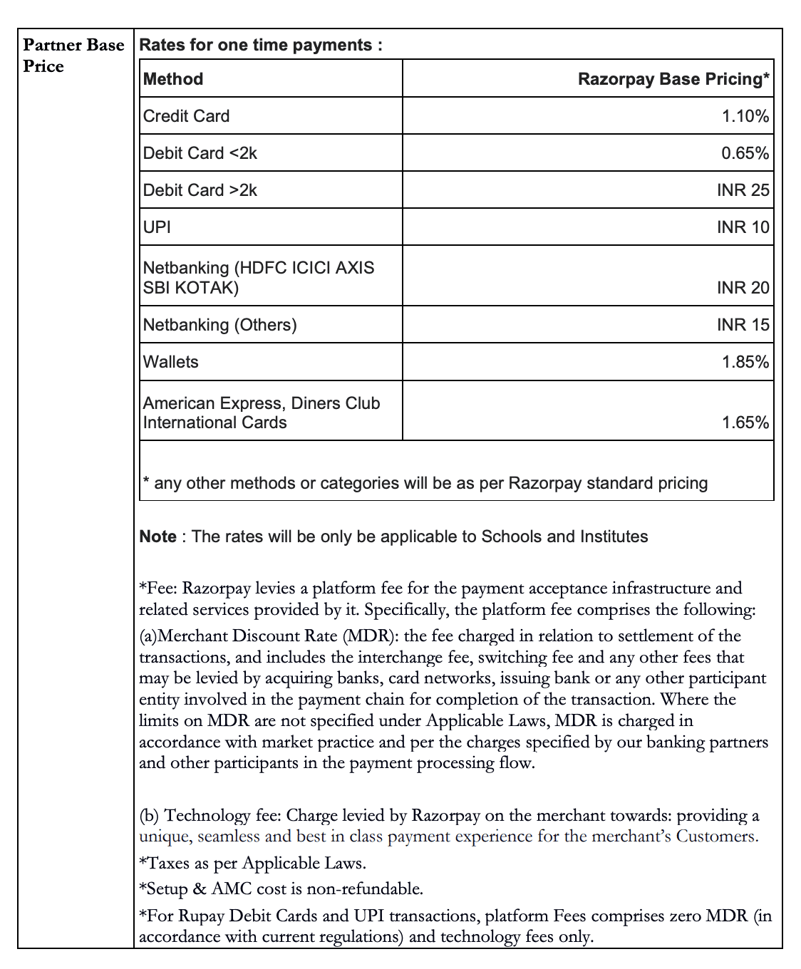 The Partner agrees that the aforementioned Partner Base Price shall be applicable for the following industries – Educational merchants (MCC code- 8211 and 8220) only. For any other industries, the standard pricing as determined by the Company shall be applicable. For payment methods not specified hereunder, the Company shall be entitled to charge the Referred Merchants as per pricing determined by the Company, at its sole discretion.