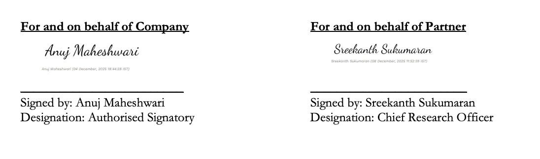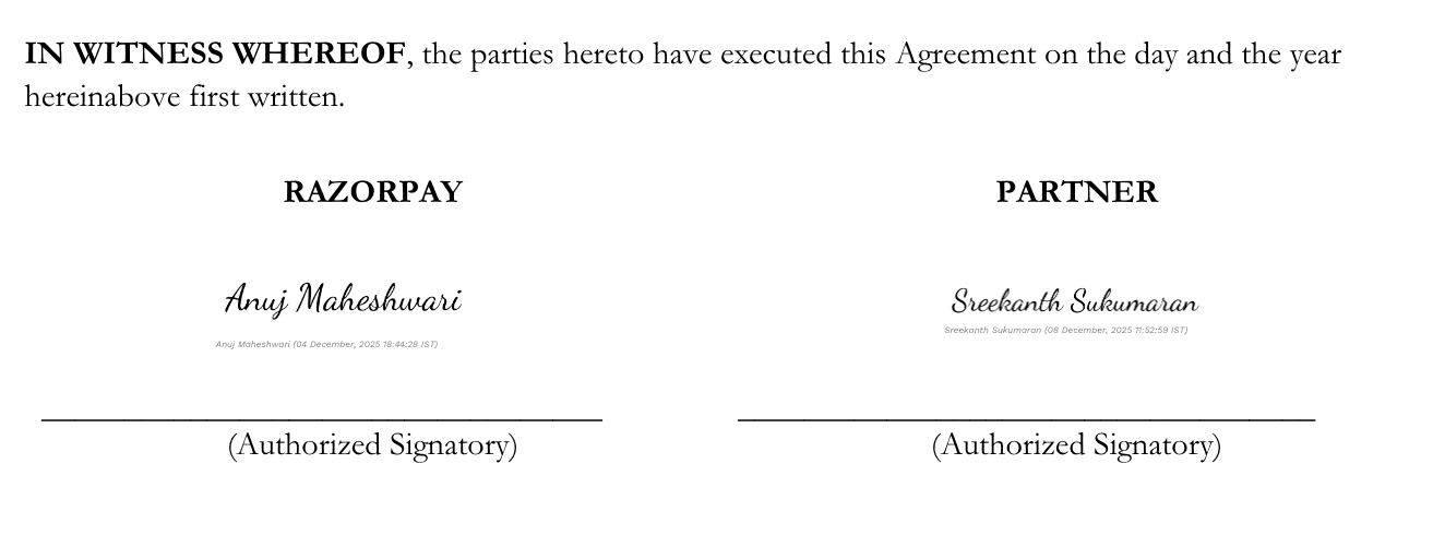11.13. Assignment: Neither Party may assign their rights and obligations under this Agreement without the other Party’s consent, provided that the Company may assign any of its rights under this Agreement to any of its Affiliates without obtaining the prior written consent of the Partner. Effective from 1st January 2026, the Agreement shall stand assigned to Razorpay Payments Private Limited.