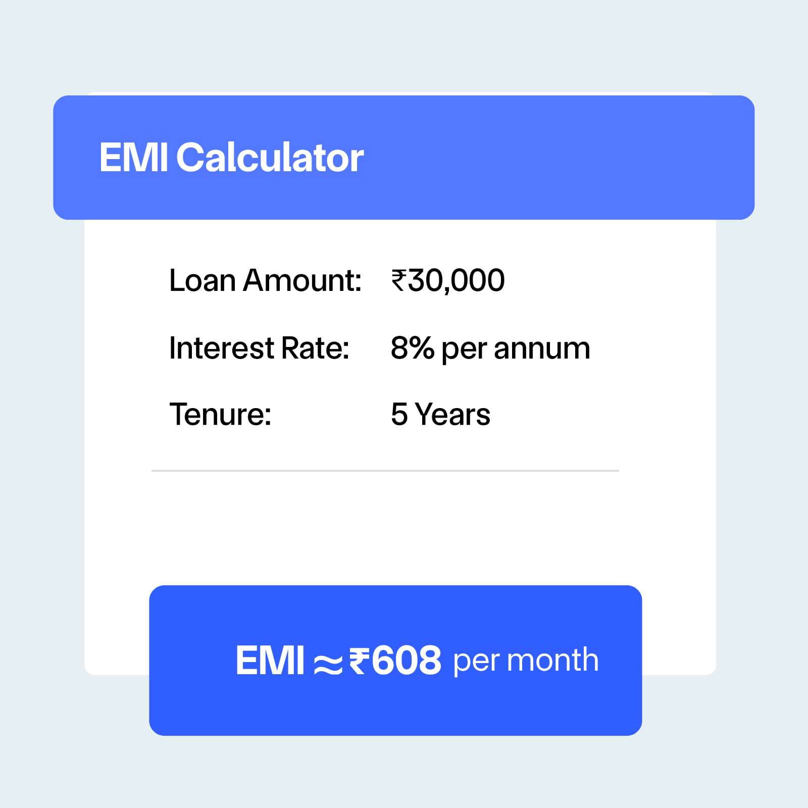 - Review Results – See your EMI, total interest, and total payable.
