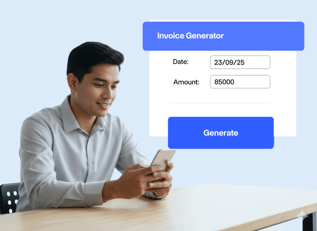 - Review all details and click Generate Invoice - download, email, or print instantly in professional format.