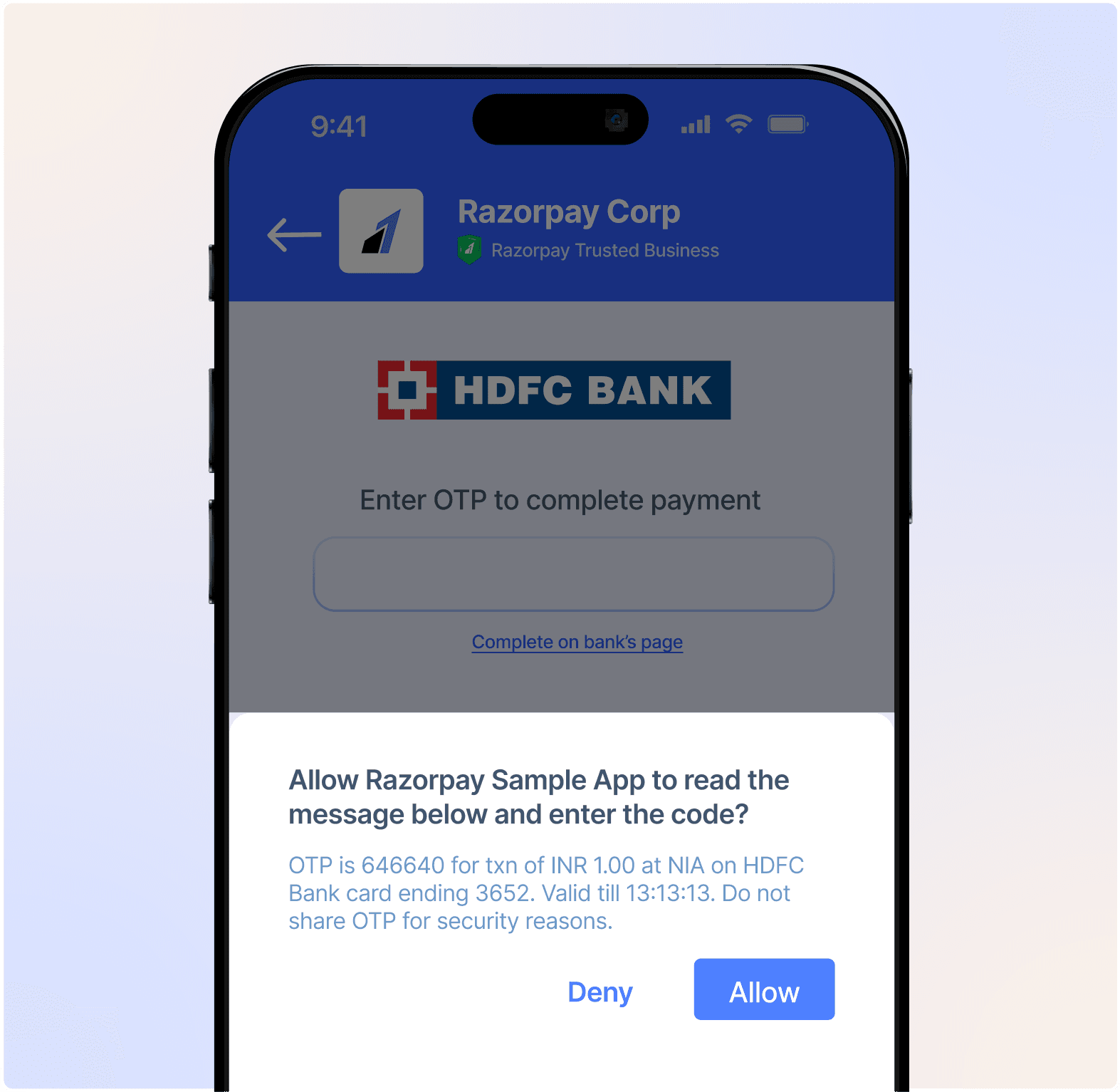 Revolutionise your authentication journey with Razorpay’s in-app native OTP solution. By eliminating redirects to bank OTP pages, you create a seamless and secure process for your customers. Enhance user experience and control every step of the authentication process with ease.