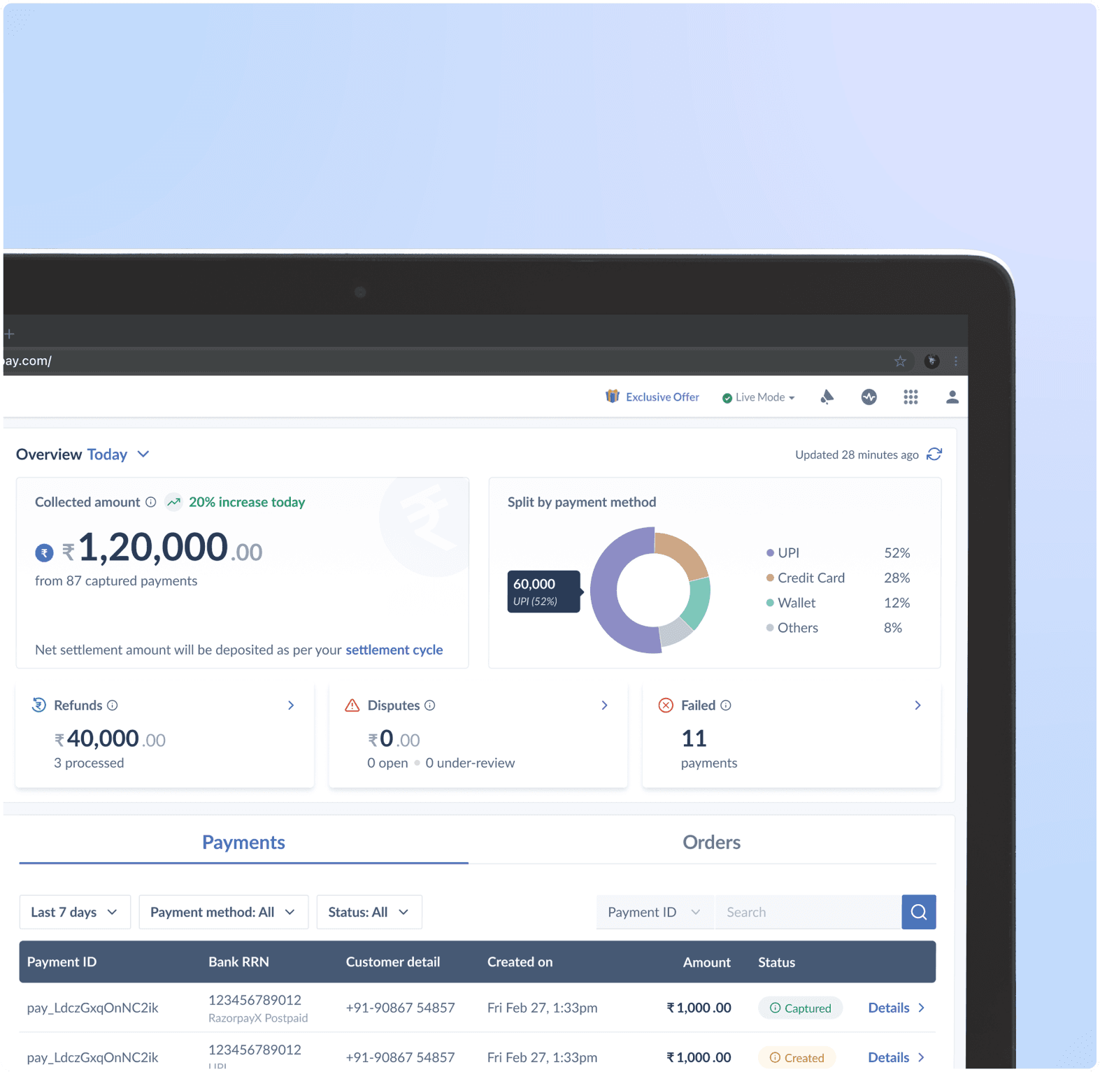 Razorpay's unified single-view dashboard simplifies operations by consolidating transactions from both online and offline channels and gives you actionable insights such as real-time transaction and usage reports, customer behaviour insights and more.