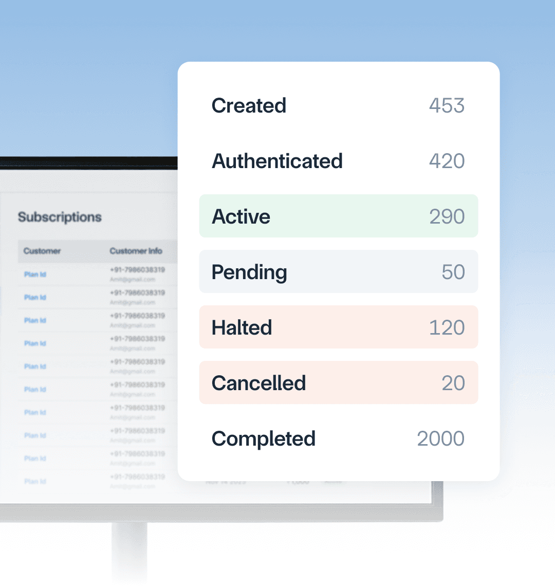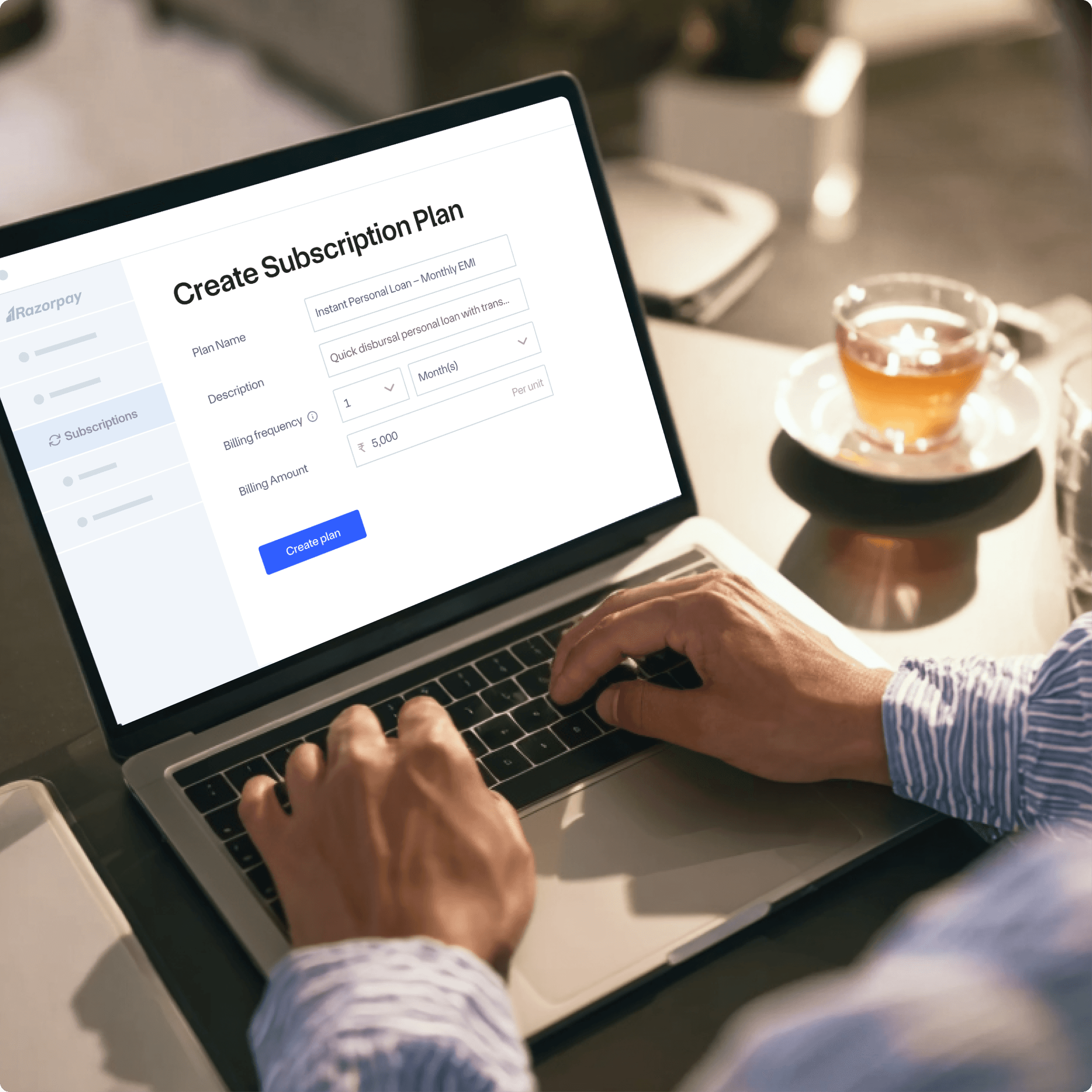 Create plans, pricing, and schedules in minutes using the Razorpay Dashboard or APIs.