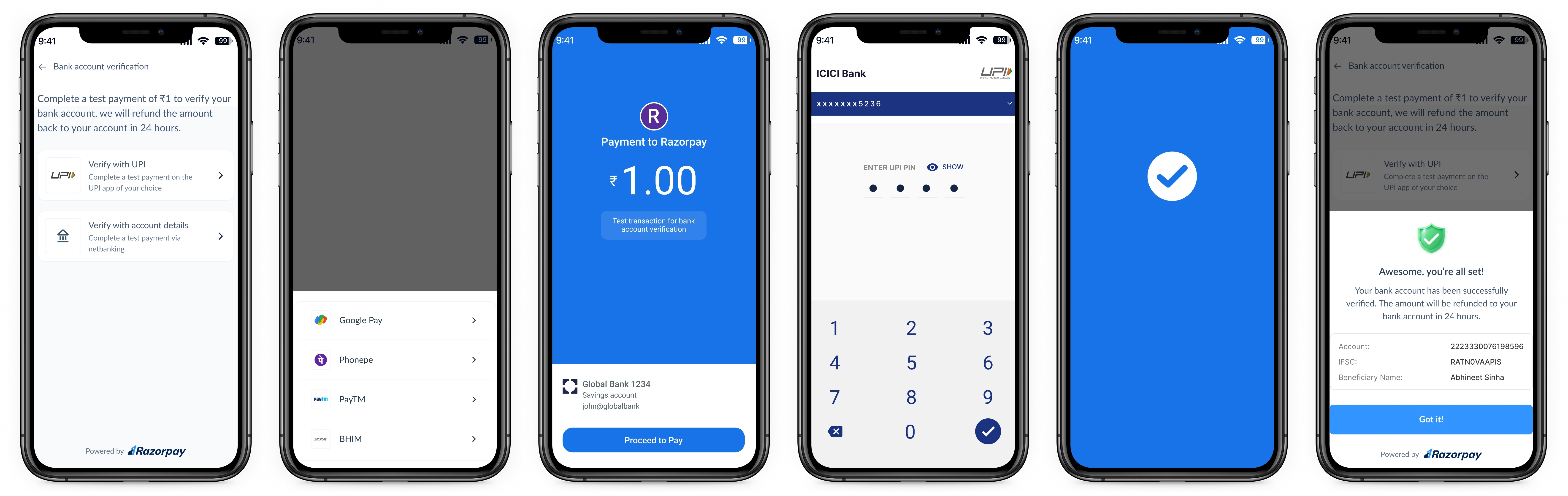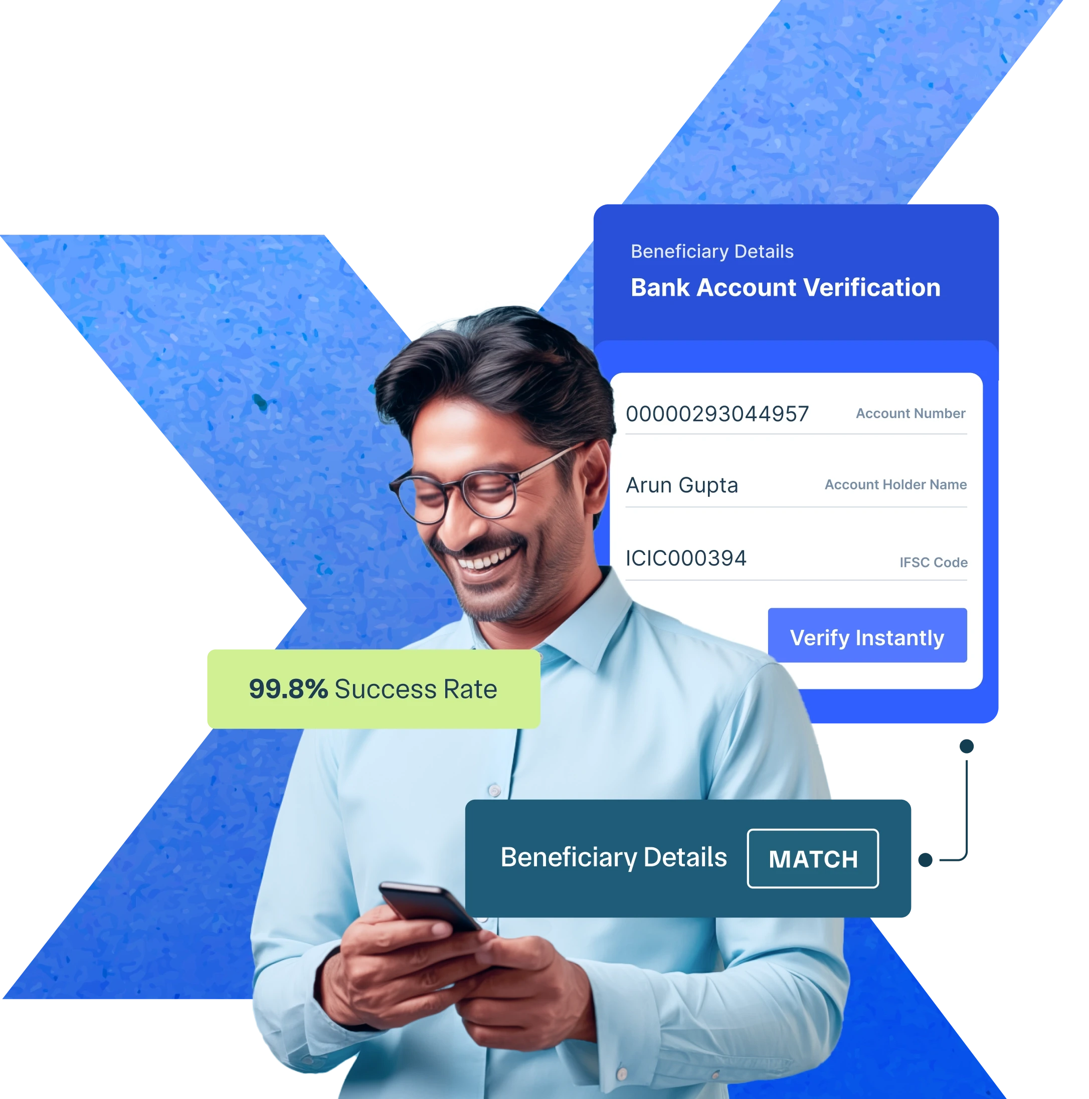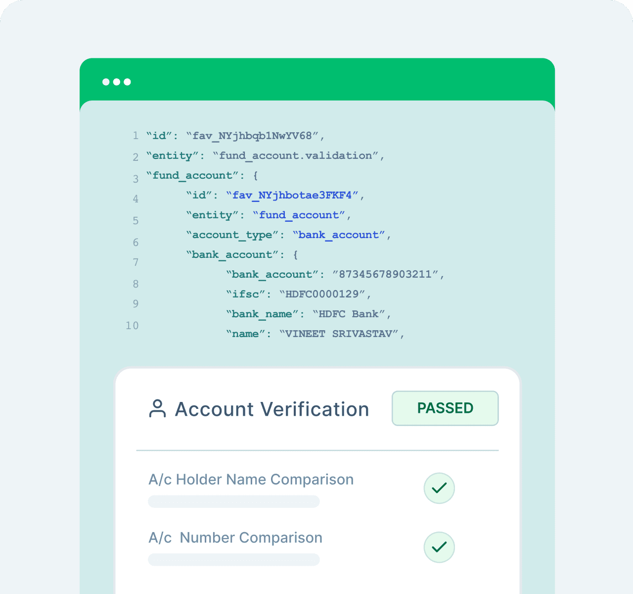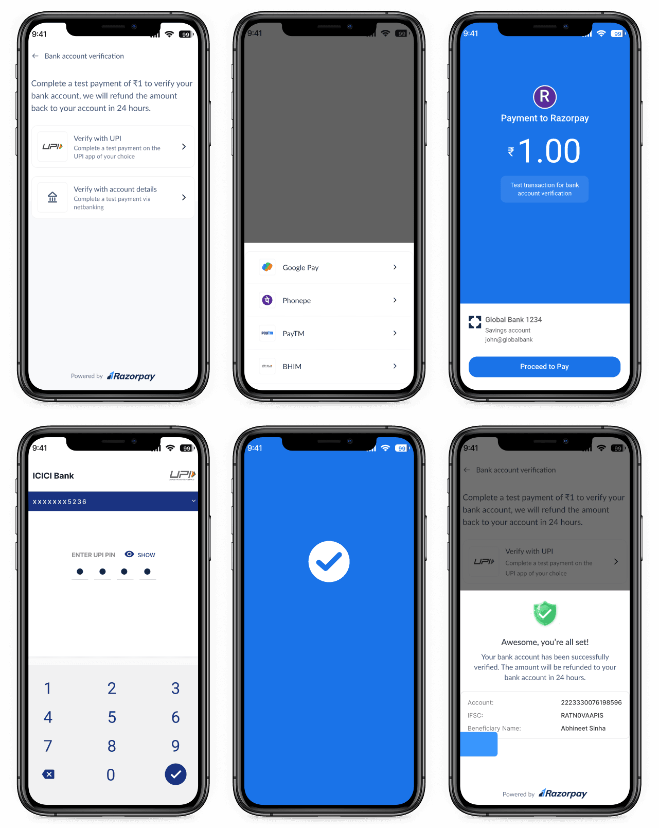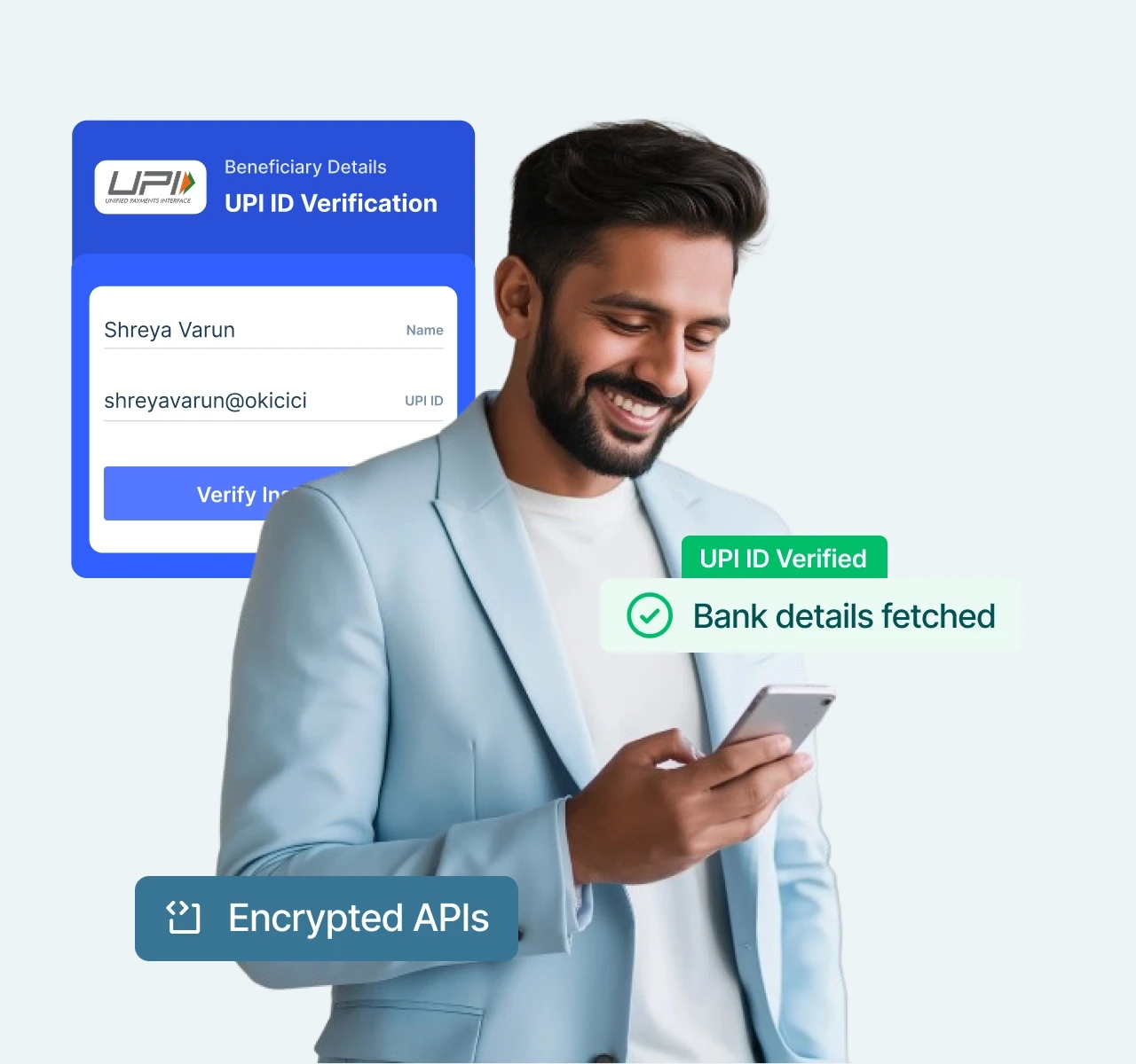 Auto-captures account number, IFSC, UPID, bank name, account type, registered name & name match score